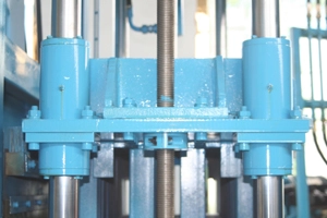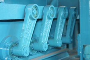 கியர்கள் மற்றும் சங்கிலிகளால் இயக்கப்படும் சின்க்ரோனஸ் டிமால்டிங் சிஸ்டம் இரண்டு டிமால்டிங் சிலிண்டர்களை ஒத்திசைவாகச் செயல்படச் செய்து அச்சுகளை நகர்த்தச் செய்கிறது.