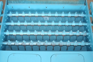 மேல் அச்சில் மர உருளைகள் உள்ளன. நடுத்தரமானது தூக்கும் வேகத்தை உறுதி செய்கிறது மற்றும் மற்ற இரண்டு இருபுறமும் மேல் அச்சின் அழுத்தத்தை உறுதி செய்கிறது.